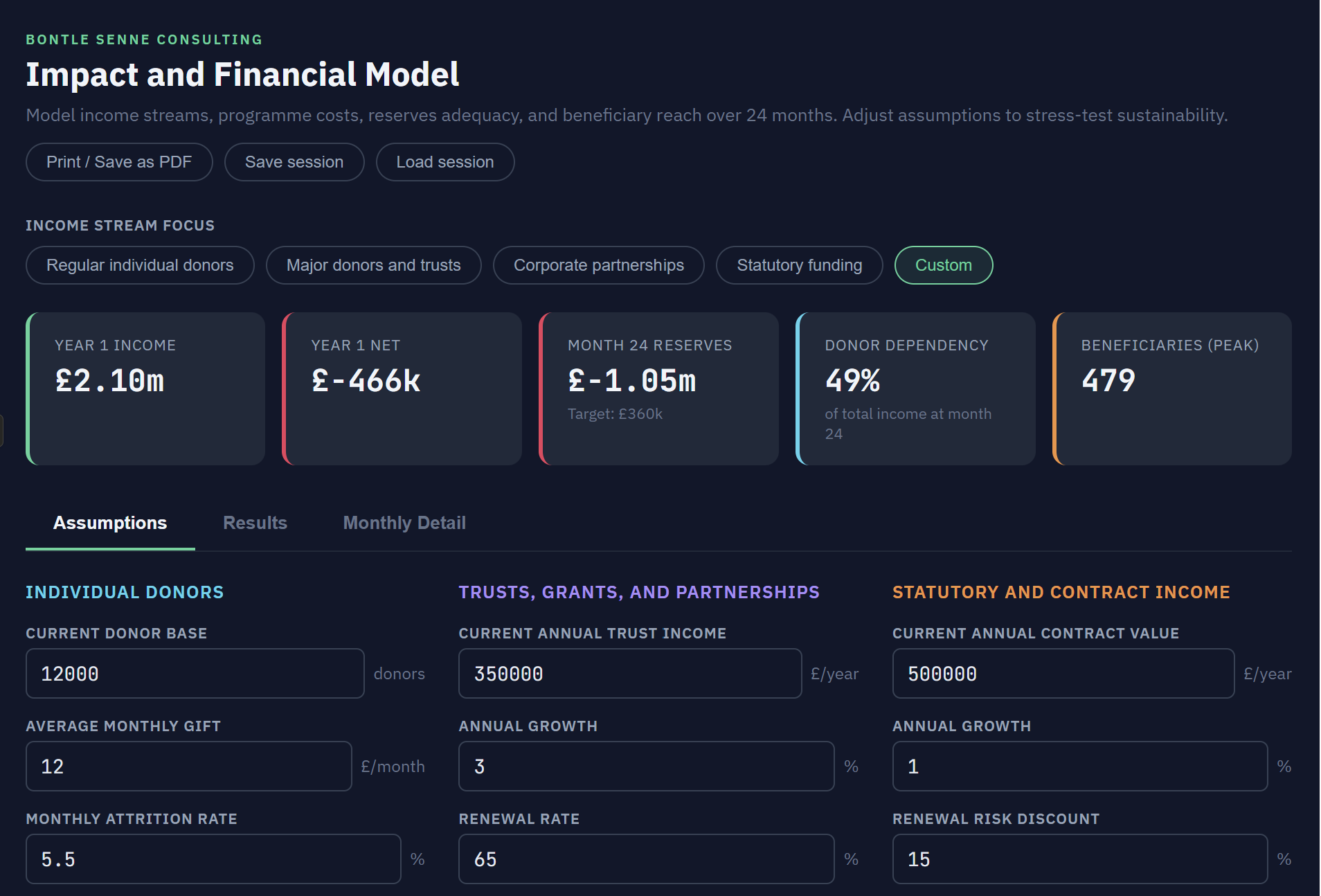 • Model income from donors, trusts, statutory contracts, and programme costs over 24 months
